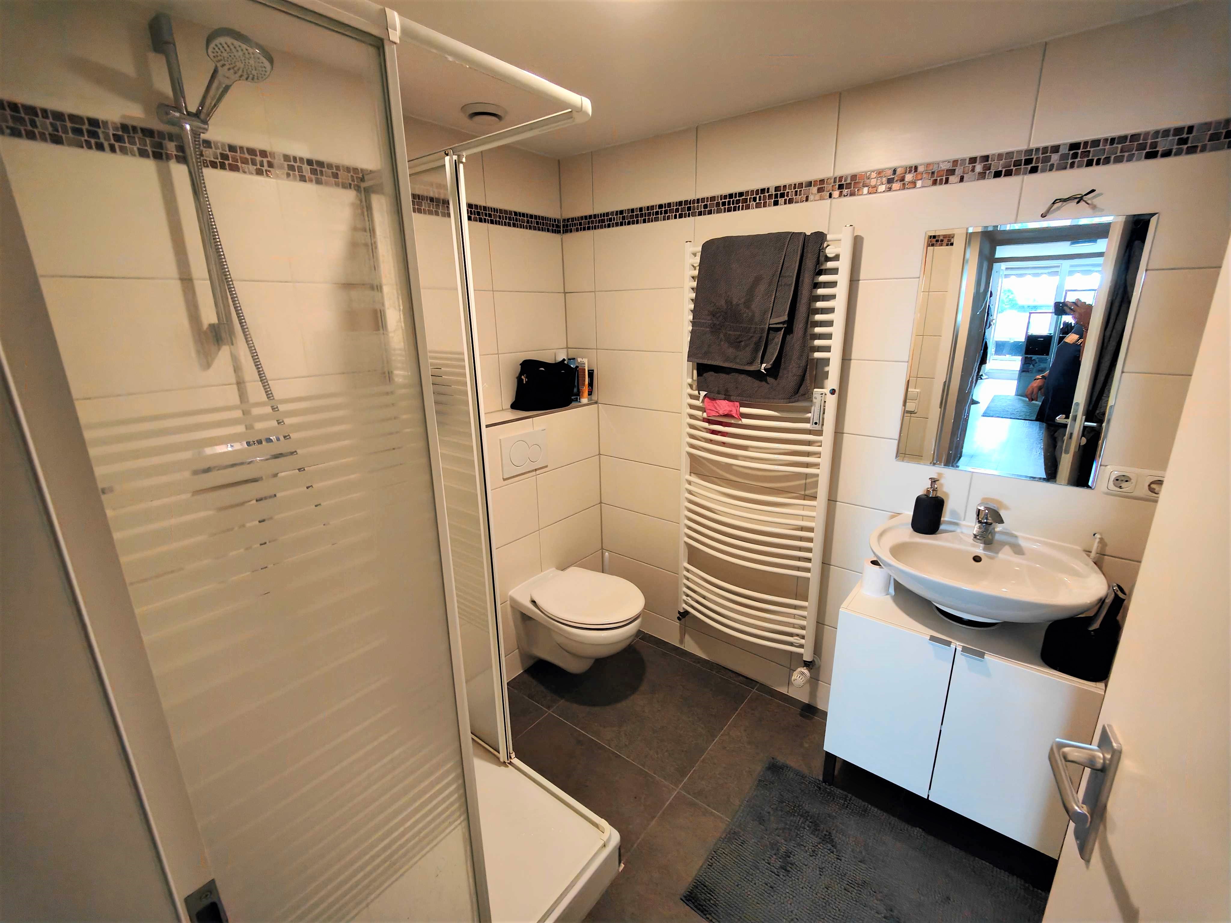 Das Bad ist modern gefliest und verfügt über eine Dusche. Ebenfalls gehört zur Wohnung ein Kellerabteil.
