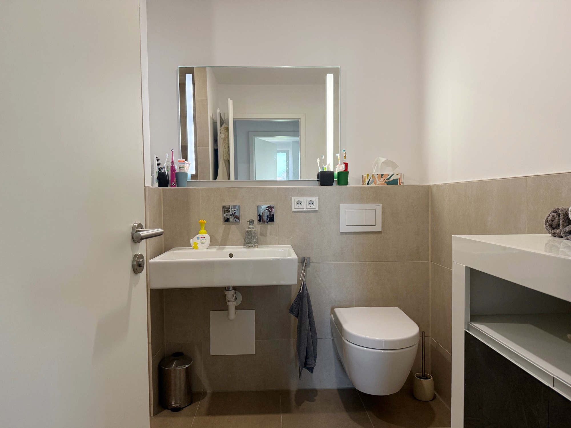 Das großzügige Bad ist modern gefliest, mit einer Dusche, großzügigen Waschbereich und breiter Spiegelfront ausgestattet.
