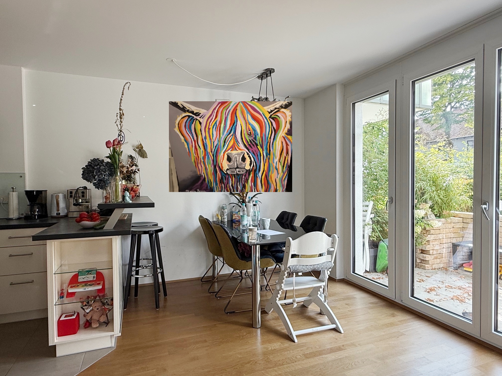 Durch die großen Fensterfonten mit Blick ins Grüne des Gartens ist dieser Bereich lichtdurchflutet und wirkt dementsprechend hell und freundlich.