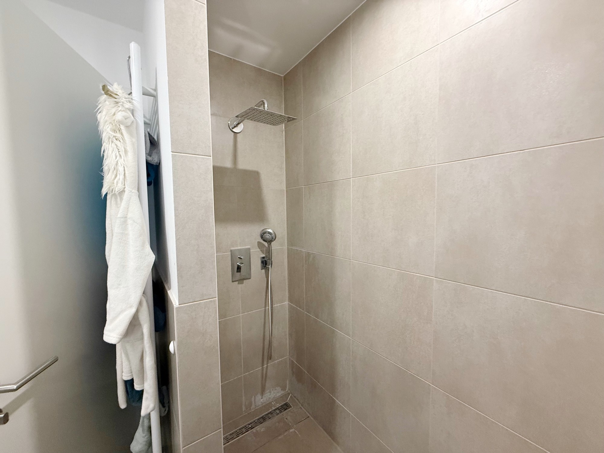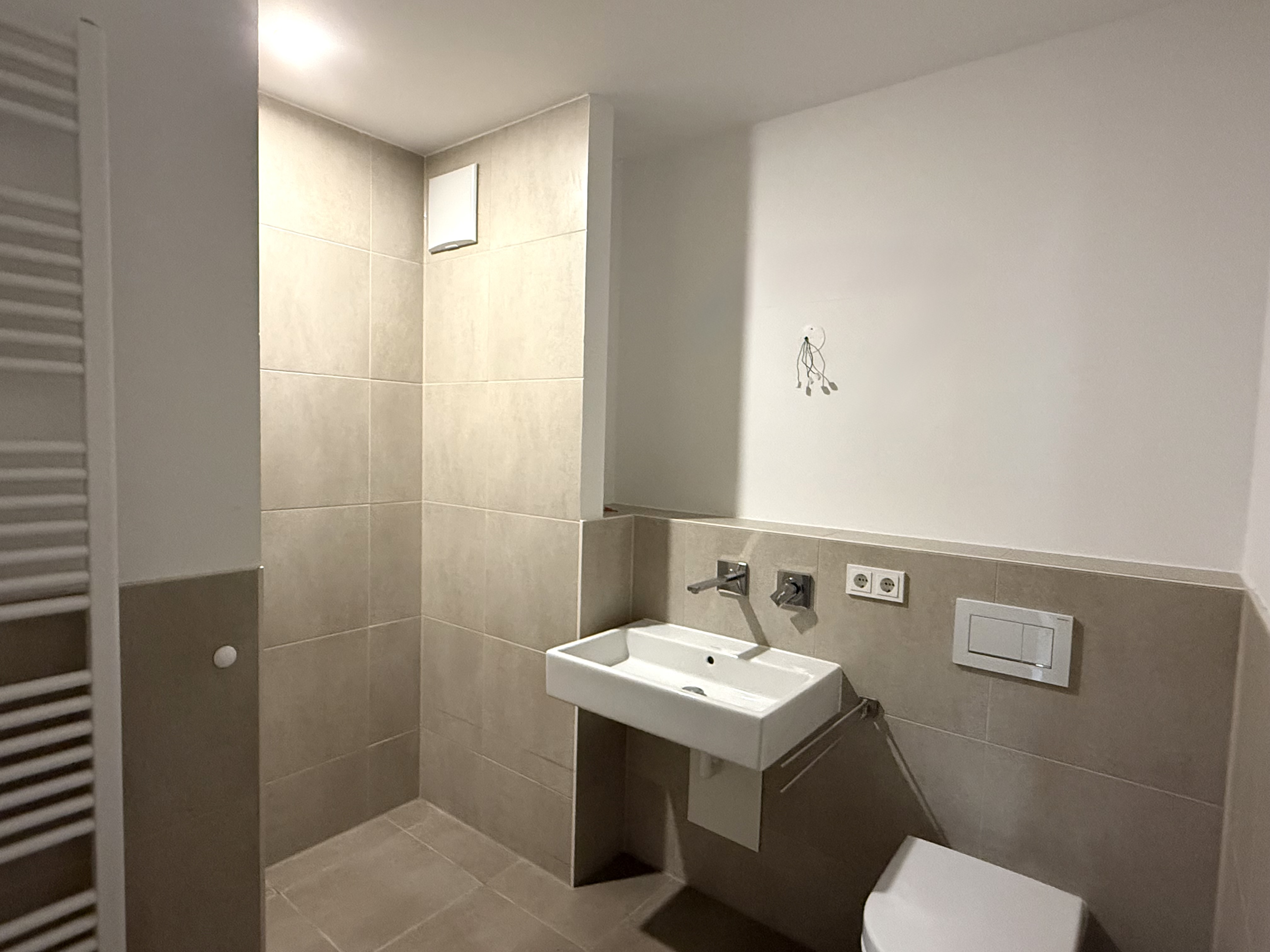 Das großzügige Bad ist modern gefliest, mit einer Dusche, großzügigen Waschbereich und breiter Spiegelfront ausgestattet.
